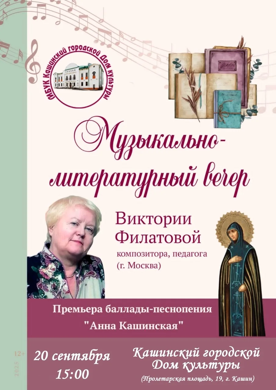 20 сентября в 15:00 на сцене Городского Дома культуры города Кашина (Пролетарская пл., 19) состоится творческая встреча с талантливым композитором, педагогом, заслуженным работником культуры России, лауреатом престижных премий Викторией Константиновной Филатовой.