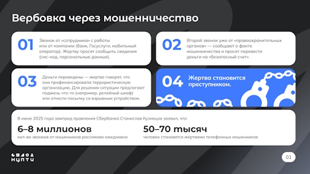 Иногда вербовка в незаконную деятельность начинается с безобидного звонка или сообщения. Разберем угрозы на реальных кейсах в карточках.