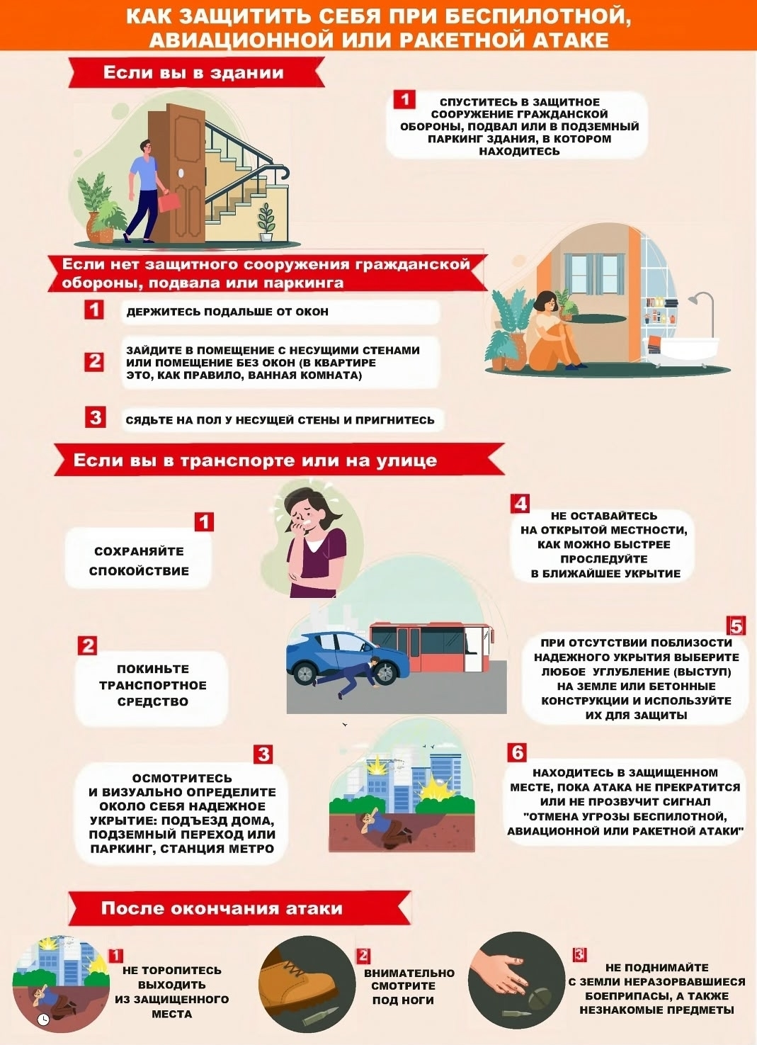 Найдите укрытие. При обнаружении приближающегося дрона или звука взрыва немедленно ищите надежное укрытие — подвал, бетонное здание или любое другое место, которое может защитить от осколков и ударной волны.