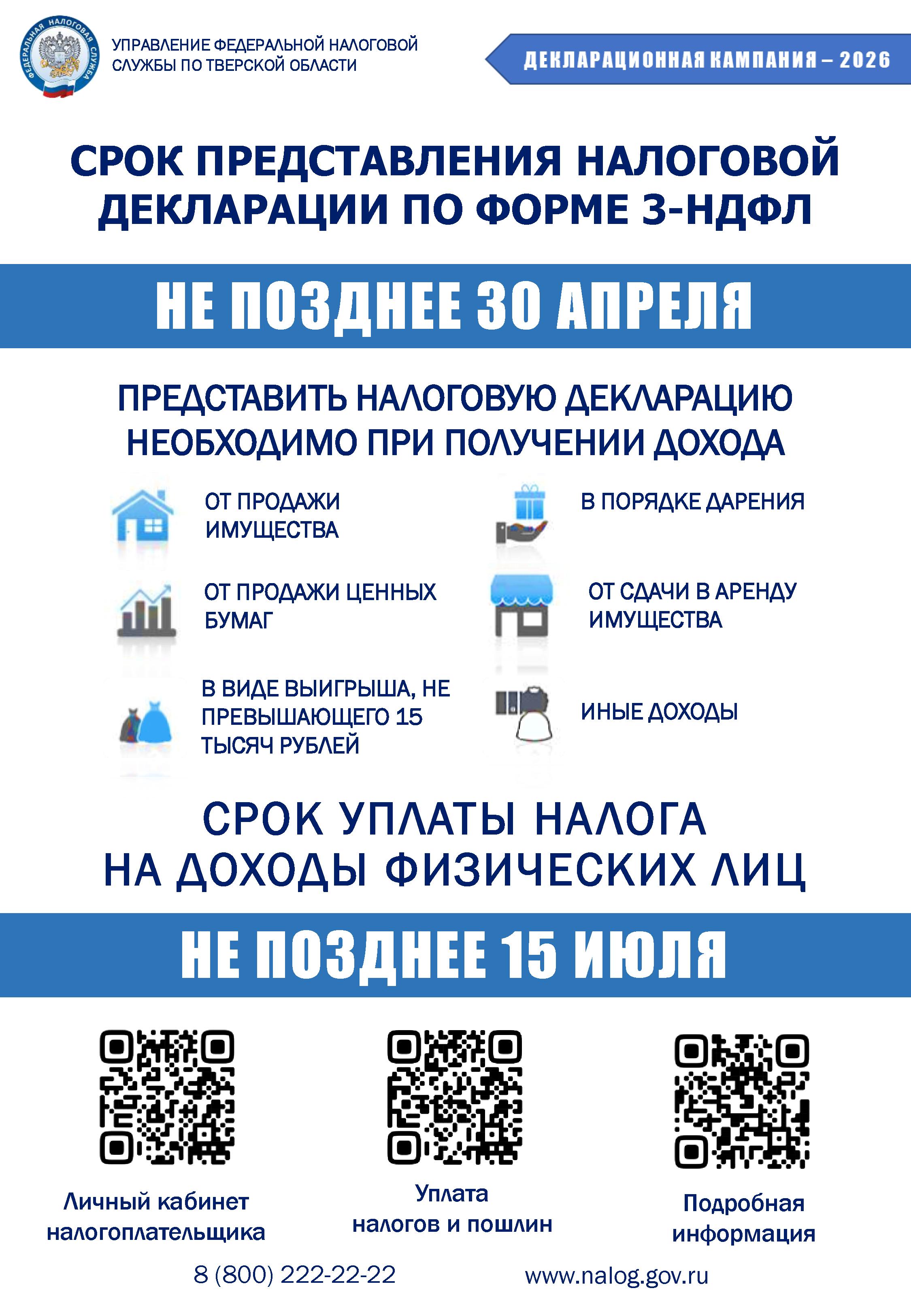 Представить налоговую декларацию по форме 3-НДФЛ о доходах, полученных в 2025 году, необходимо не позднее 30 апреля 2026 года.