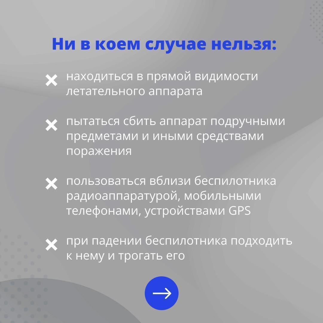 ❌Запрещается находиться в прямой видимости БВС, пытаться сбить его подручными предметами и иными средствами поражения, пользоваться вблизи радиоаппаратурой, мобильными телефонами, устройствами GPS.