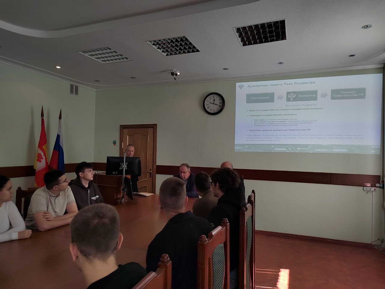 В основу лекции легла презентация издания «Имена героев на карте России», подготовленного Росреестром к 80-летию Победы в Великой Отечественной войне и посвященного ее героям, а также героям современности, чьи имена были увековечены в наименованиях географических объектов решениями Правительства Российской Федерации. Студентам, обучающимся по направлениям подготовки «Землеустройство и кадастры» и «Управление жизненным циклом объектов недвижимости», на наглядных примерах была продемонстрирована связь истории, географии и современной государственной политики по сохранению памяти о защитниках Отечества, а также раскрыта роль Росреестра в этом процессе.
