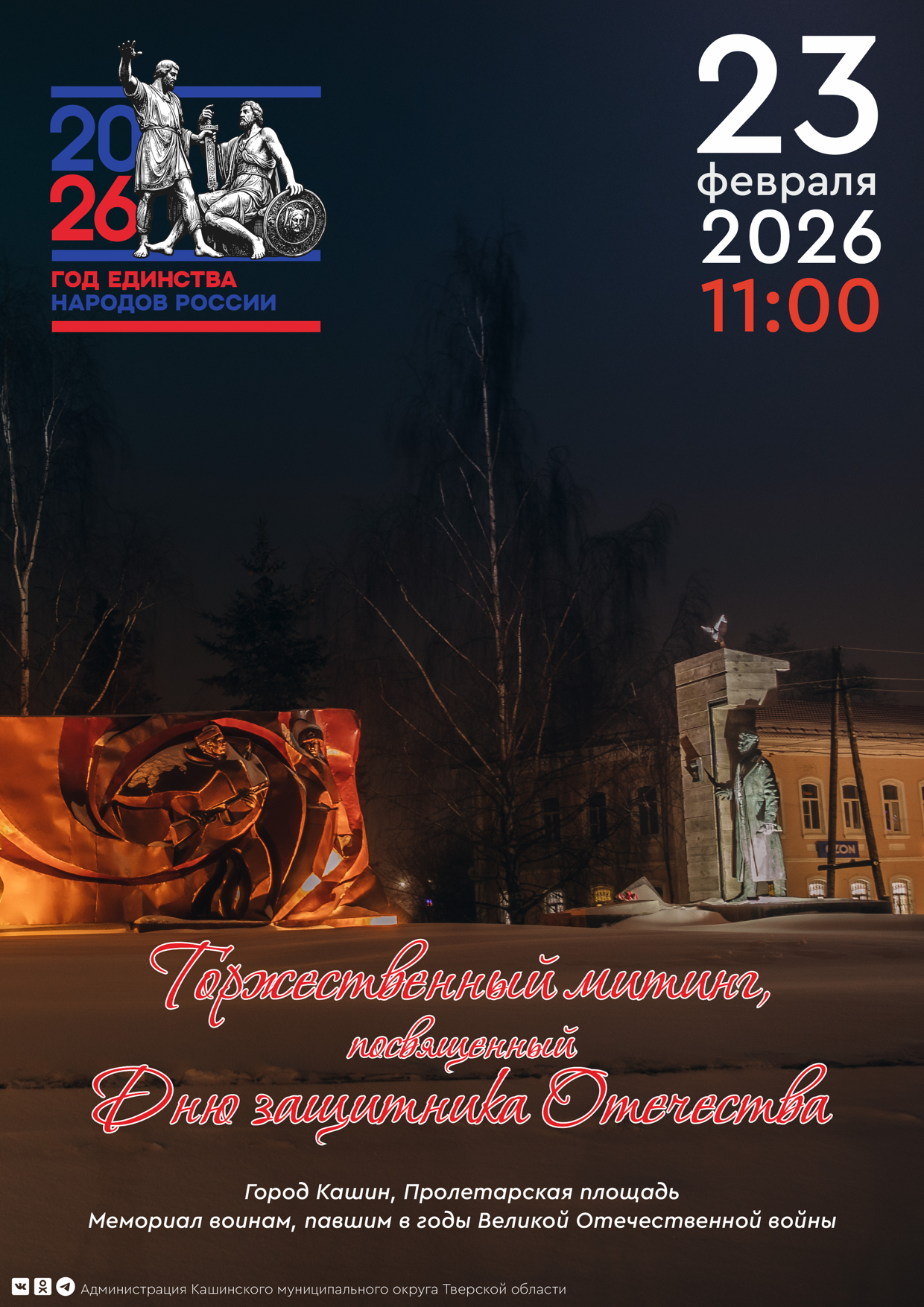 23 февраля в 11:00 у мемориала воинам, павшим в годы Великой Отечественной войны, на Пролетарской площади города Кашина состоится митинг, посвящённый Дню защитника Отечества.