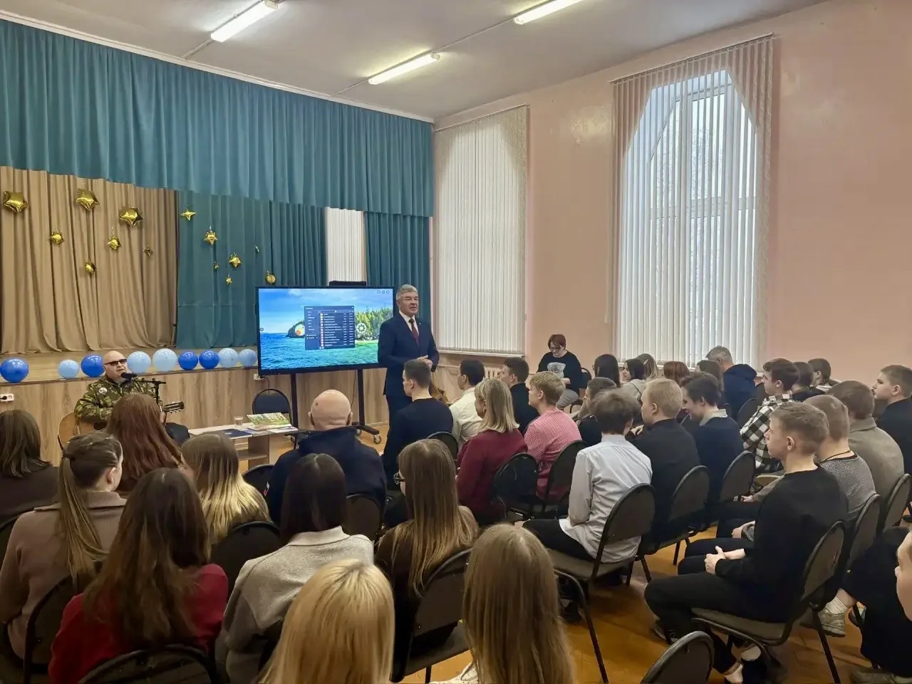 Особый отклик у ребят вызвали авторские песни Валерия Монастырева — «Наша Катюша», «Казачка Ксения», «Десантная тельняшка» и другие. Куплет легендарной «Катюши» зал исполнил вместе с автором.