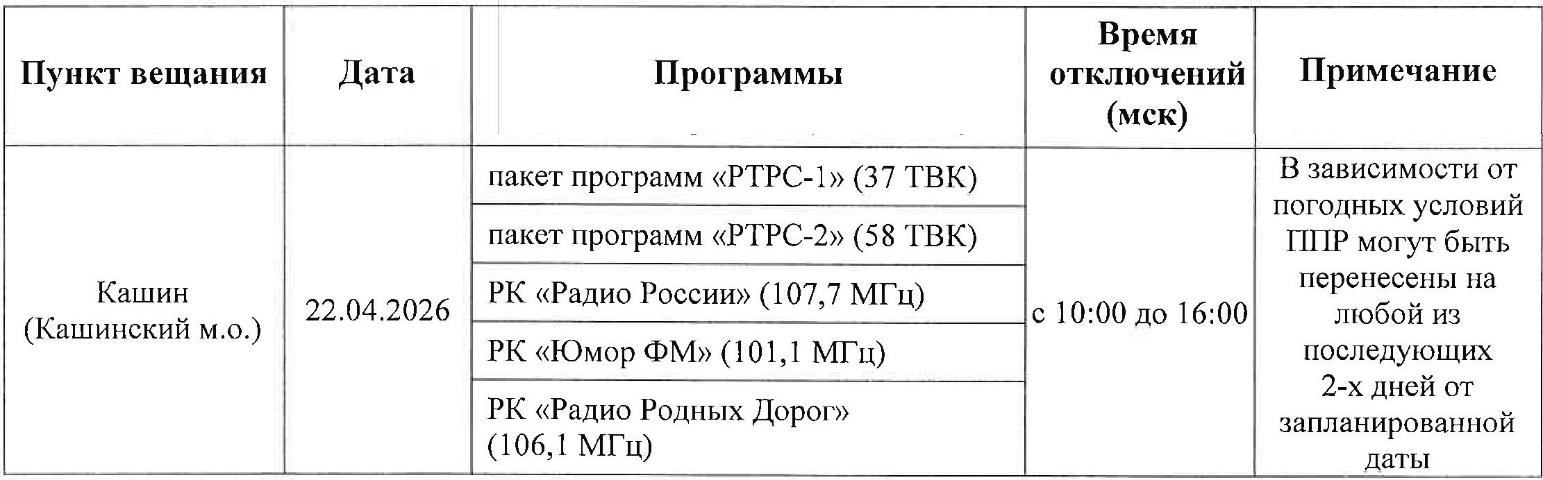 22 апреля 2026 года в Кашинском муниципальном округе возможны перерывы в трансляции теле- и радиопрограмм в связи с проведением плановых работ на объекте филиала РТРС «Тверской ОРТПЦ» РТС «Кашин».