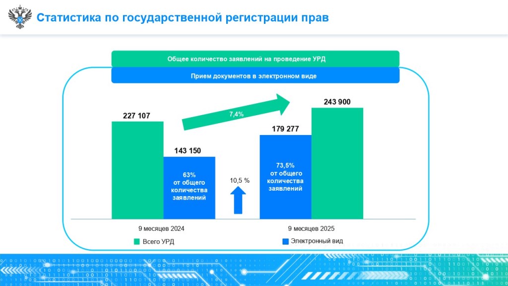 При этом на 10,5% выросла доля заявлений, поступивших в тверской Росреестр в электронном виде: в отчетном периоде 2025 года она составила 73,5% (179,3 тыс. заявлений), а за 9 месяцев 2024 года – 63% (143,2 тыс. заявлений).