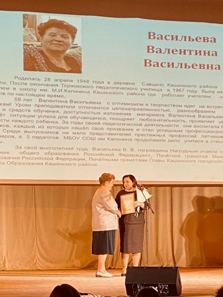 Особое внимание было уделено педагогическому подвигу Валентины Васильевны Васильевой, учителя начальных классов школы имени М.И. Калинина, чей трудовой стаж составляет впечатляющие 58 лет. Ей была предоставлена честь быть внесённой в Книгу почёта работников педагогического труда Кашинского округа. На протяжении десятилетий Валентина Васильевна успешно передает знания и жизненный опыт нескольким сотням учеников.