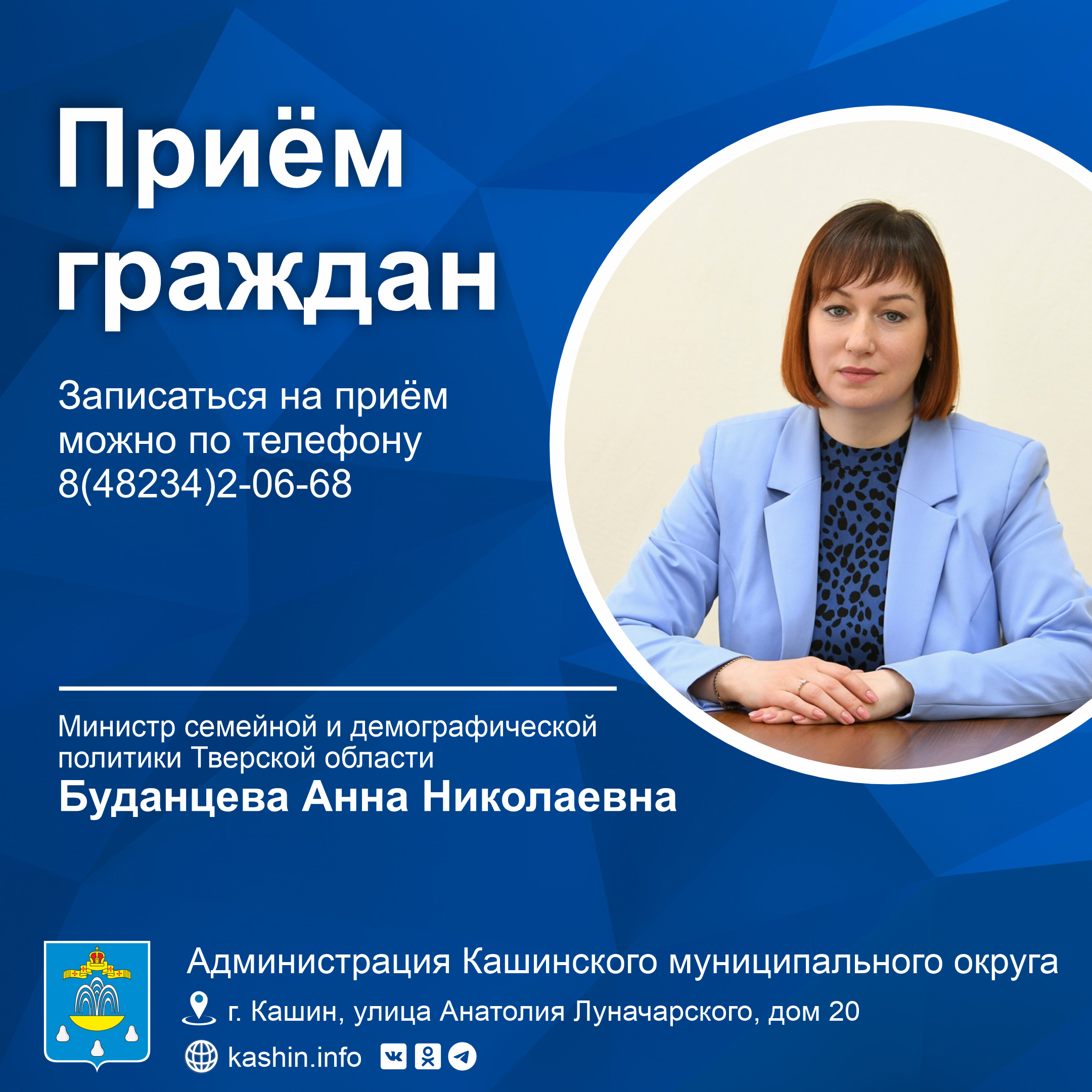 22 октября с 11:00 до 12:00 в здании Администрации Кашинского муниципального округа Тверской области прием граждан проводит Министр семейной и демографической политики Тверской области Буданцева Анна Николаевна.