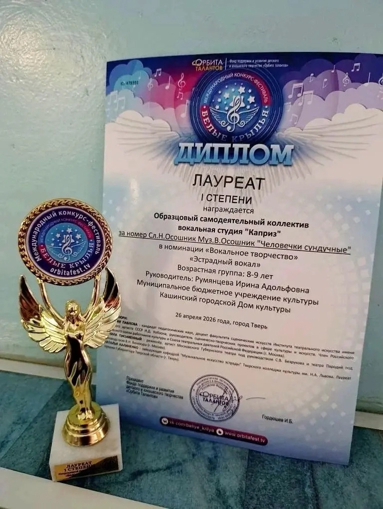 26 апреля в Твери состоялся Международный конкурс-фестиваль «Белые крылья», организованный фондом поддержки и развития детского и юношеского творчества «Орбита талантов». В престижном творческом состязании приняли участие коллективы из разных регионов, а город Кашин достойно представили воспитанники местных творческих студий городского дома культуры.